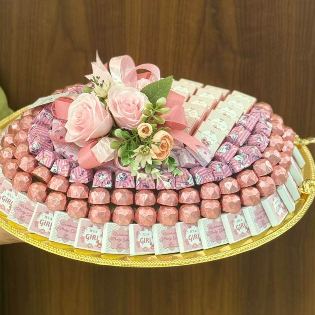 Featuring an assortment of premium chocolates, each piece is handpicked for quality and taste, wrapped in soft pastel tones to match the joyful occasion. The tray is beautifully decorated with baby-themed embellishments—think satin ribbons, delicate flowers, and charming touches in pink and gold.